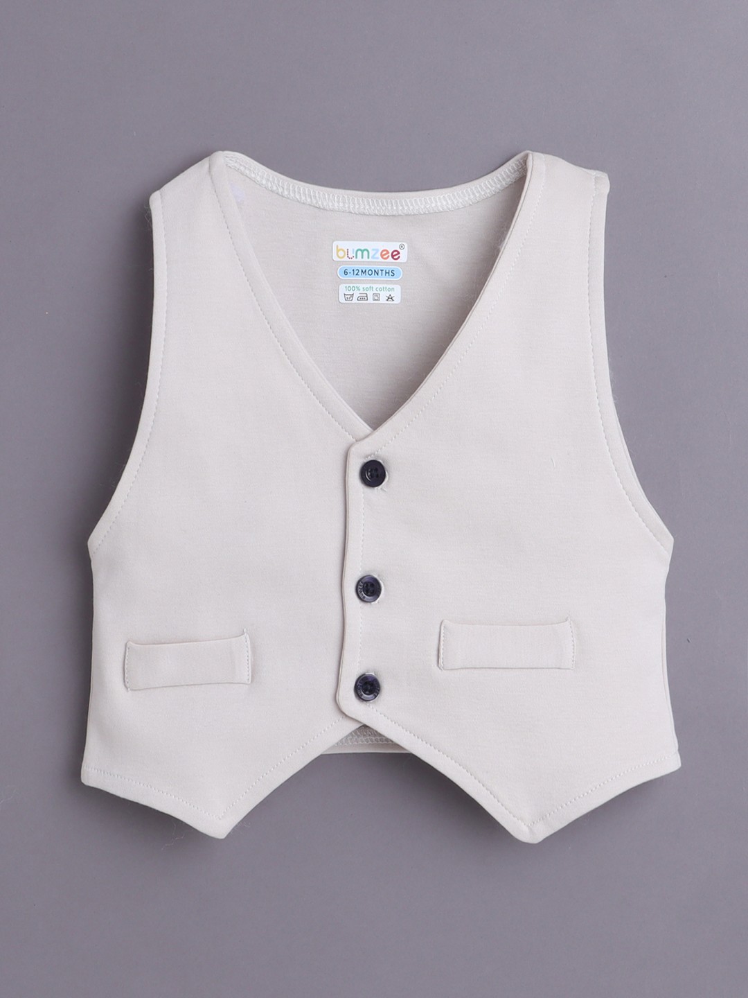 BUMZEE Beige & Navy Boys Full Sleeves Shirt Waistcoat & Pant Set With Applique Bow