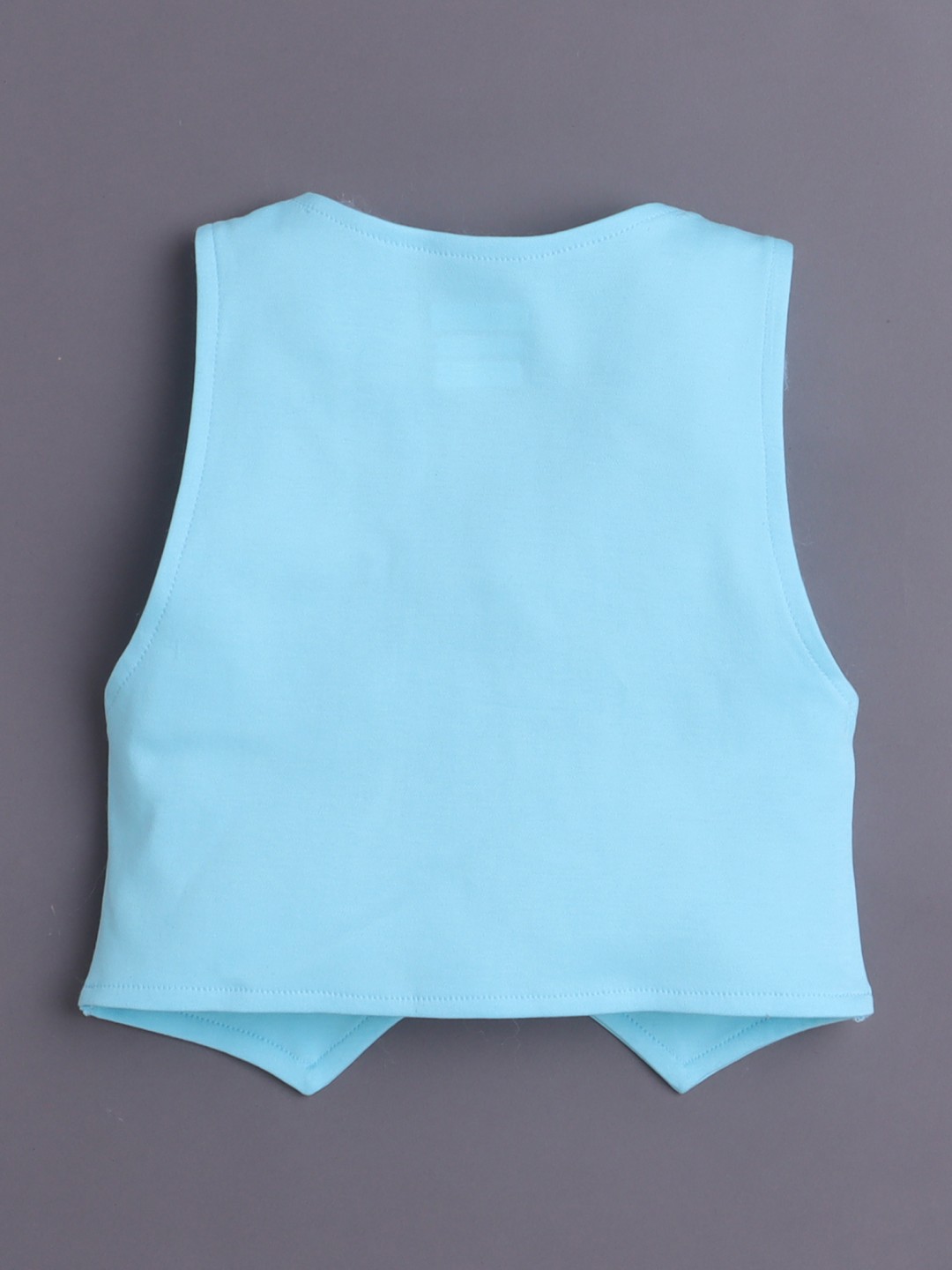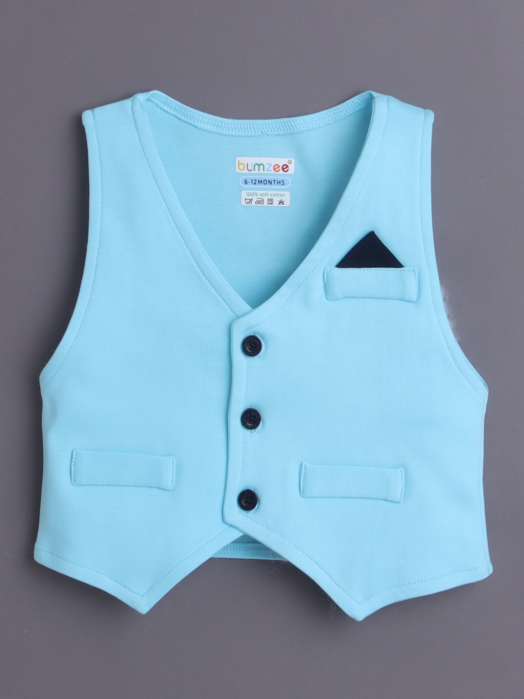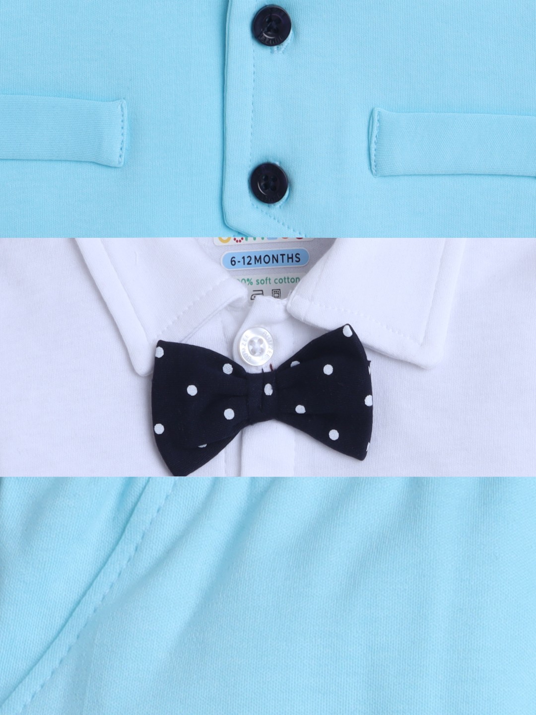 BUMZEE Sky Blue & White Boys Full Sleeves Shirt Waistcoat & Pant Set With Applique Bow