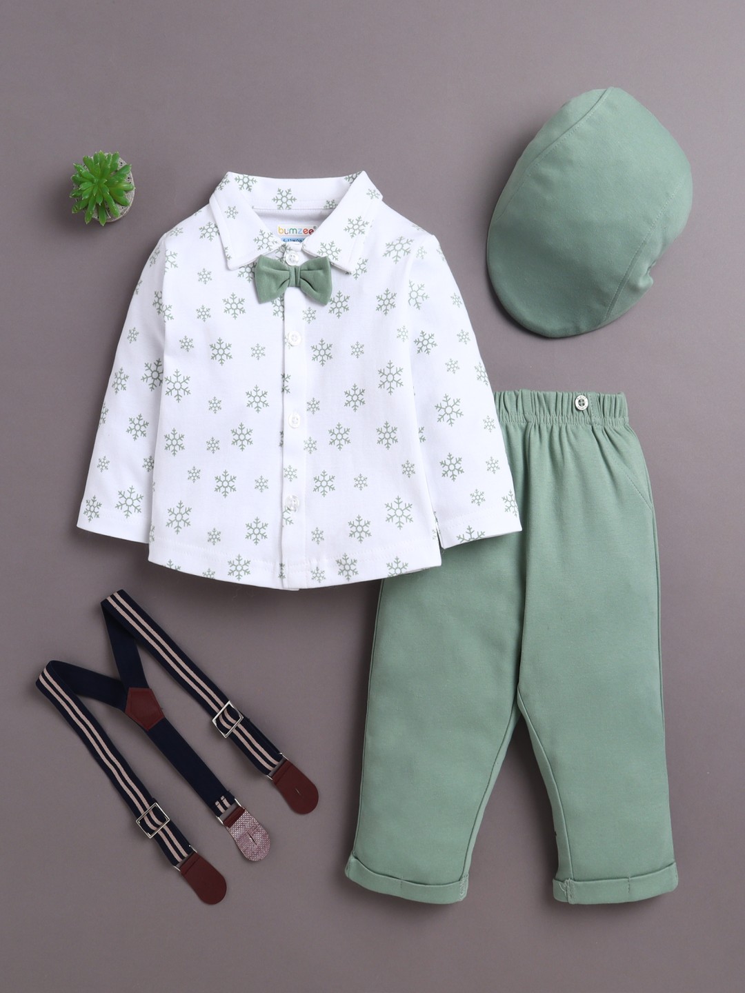 BUMZEE Sky Blue & White Boys Full Sleeves Shirt Pant Set With Suspender & Cap