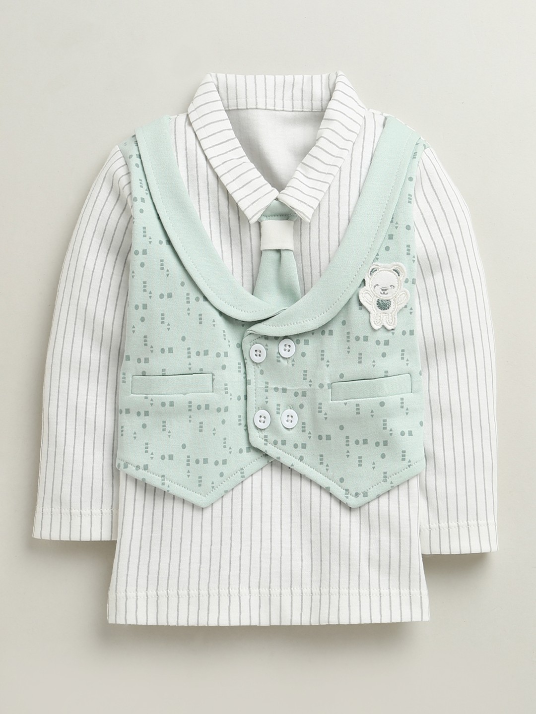 BUMZEE Powder Blue & White Boys Full Sleeves Shirt Waistcoat & Pant Set With Applique Bow
