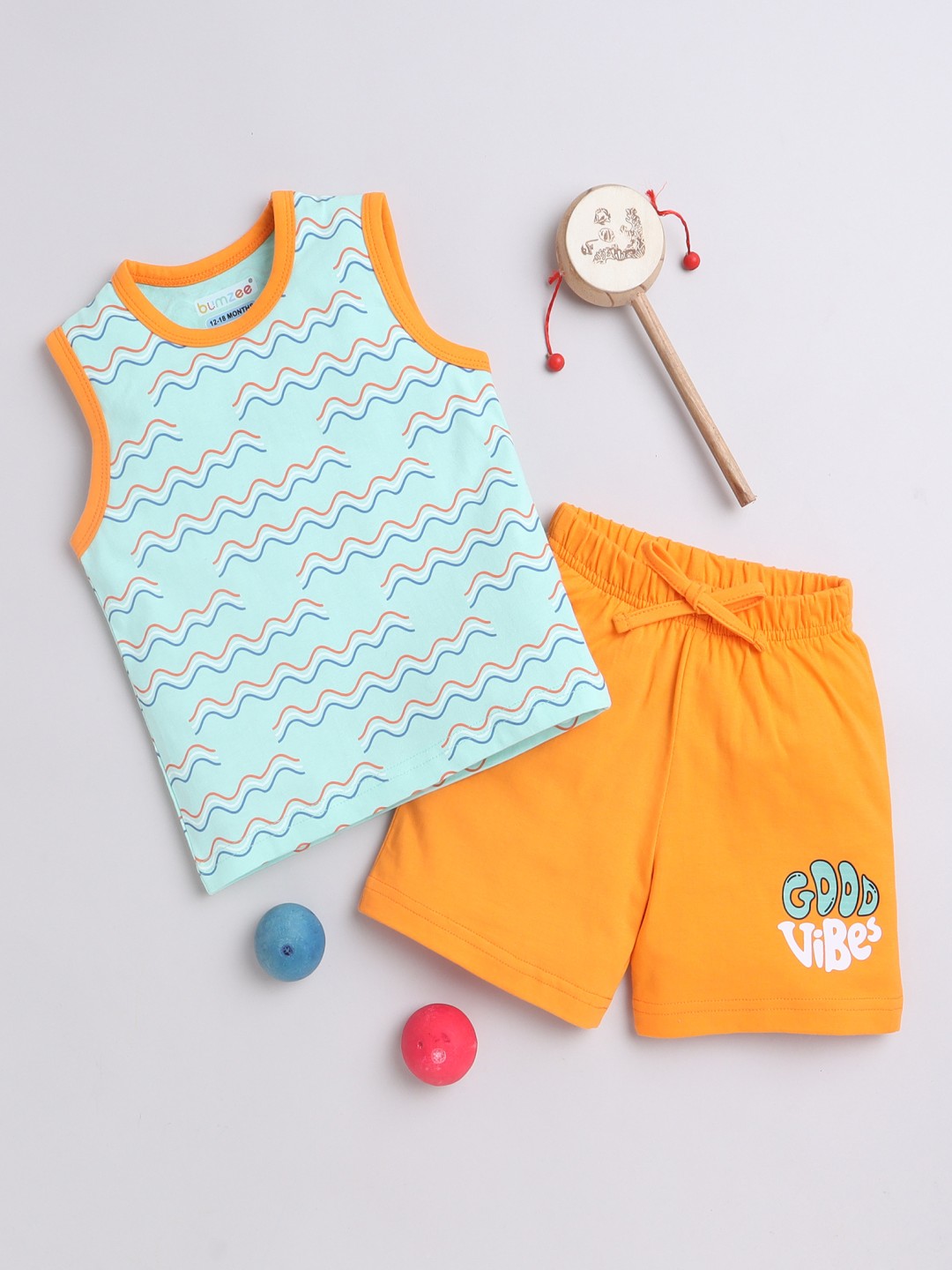 BUMZEE Mint Green & Orange Boys Sleeveless T-Shirt & Short Set