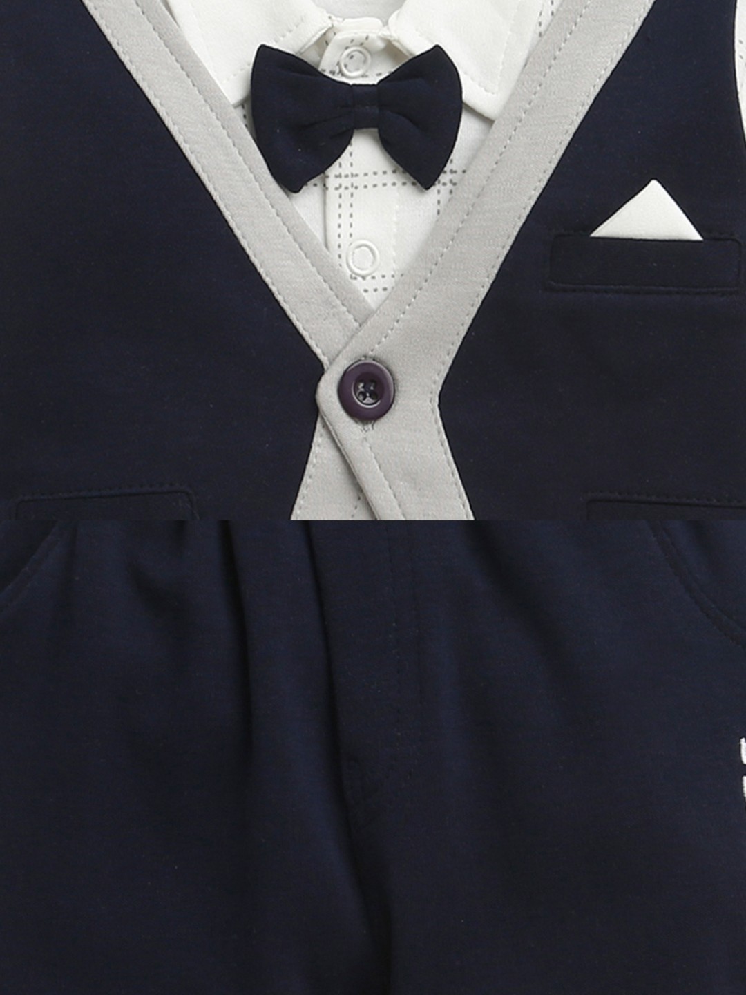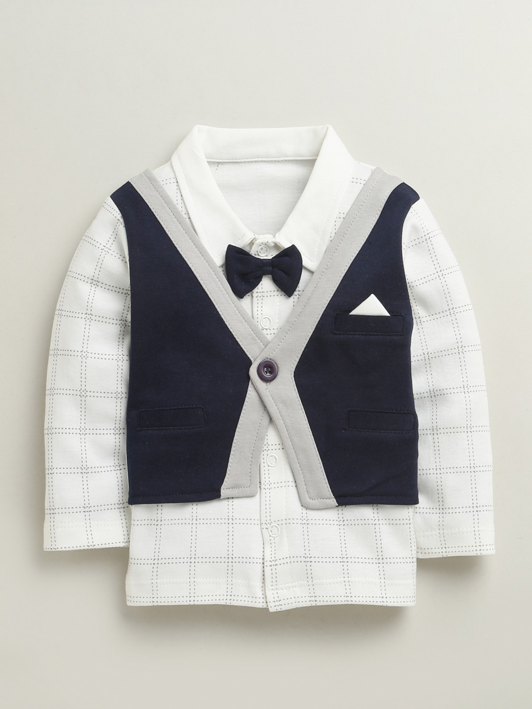 BUMZEE Navy & White Boys Full Sleeves Shirt Waistcoat & Short Set With Applique Bow