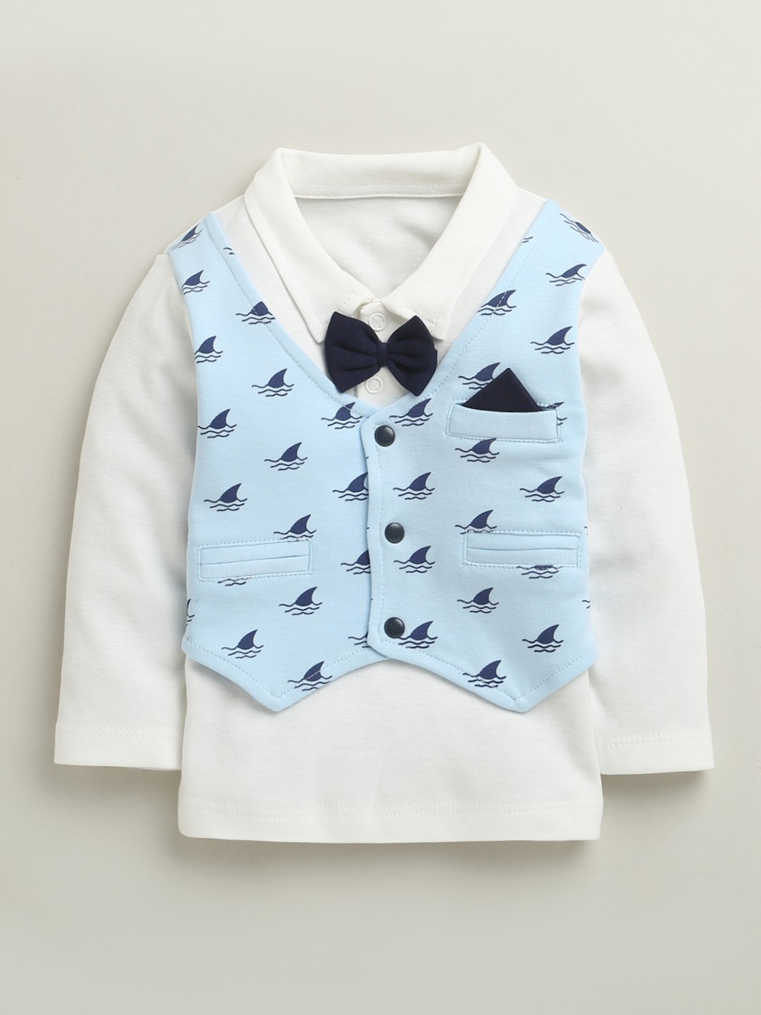 BUMZEE Sky Blue & White Boys Full Sleeves Shirt Waistcoat & Pant Set With Applique Bow