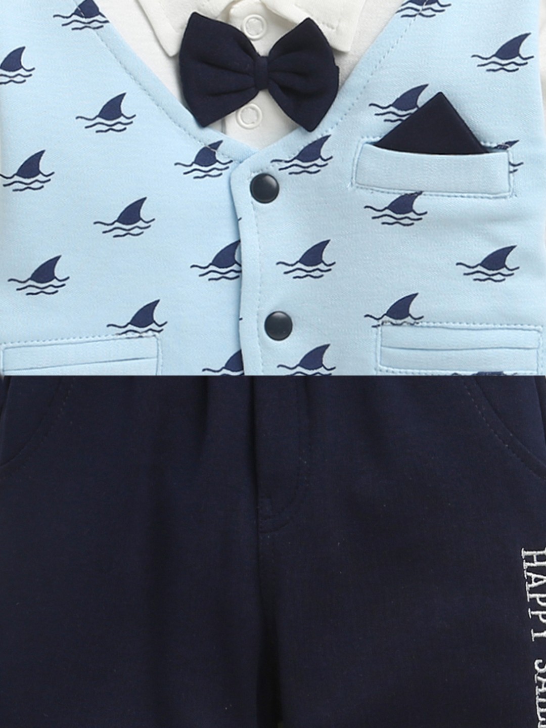 BUMZEE Navy & White Boys Full Sleeves Shirt Waistcoat & Short Set With Applique Bow