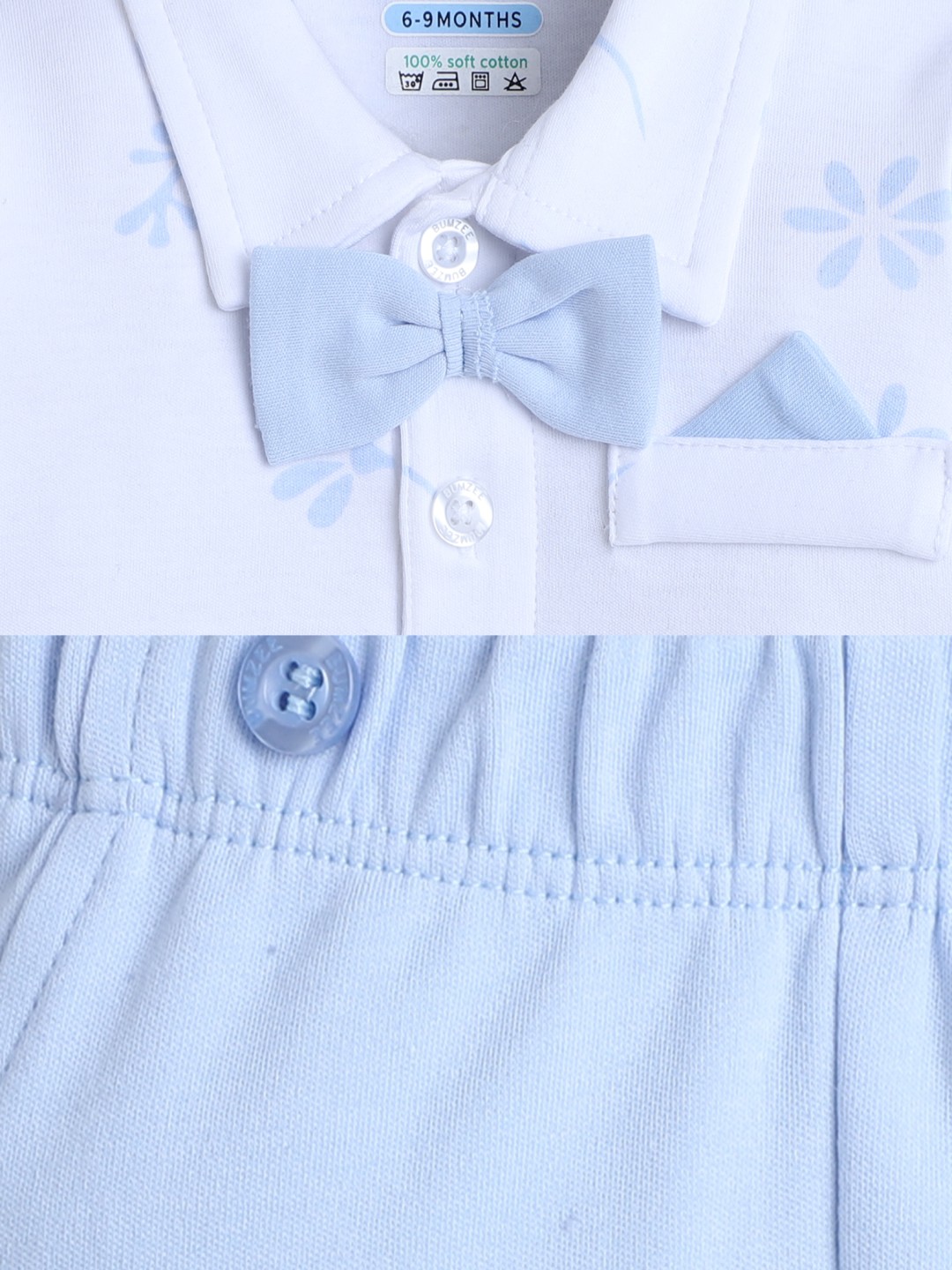 BUMZEE Sky Blue & White Boys Half Sleeves Shirt & Short Set With Bow Suspender & Cap