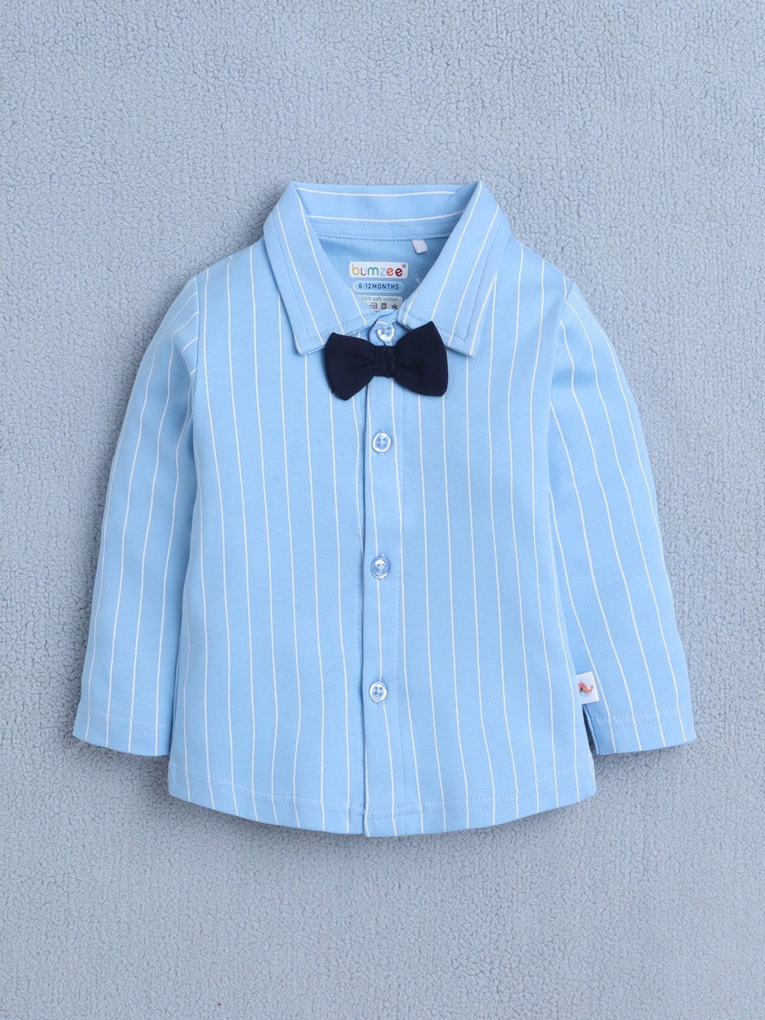 BUMZEE Sky Blue & White Boys Full Sleeves Shirt Waistcoat & Pant Set With Applique Bow