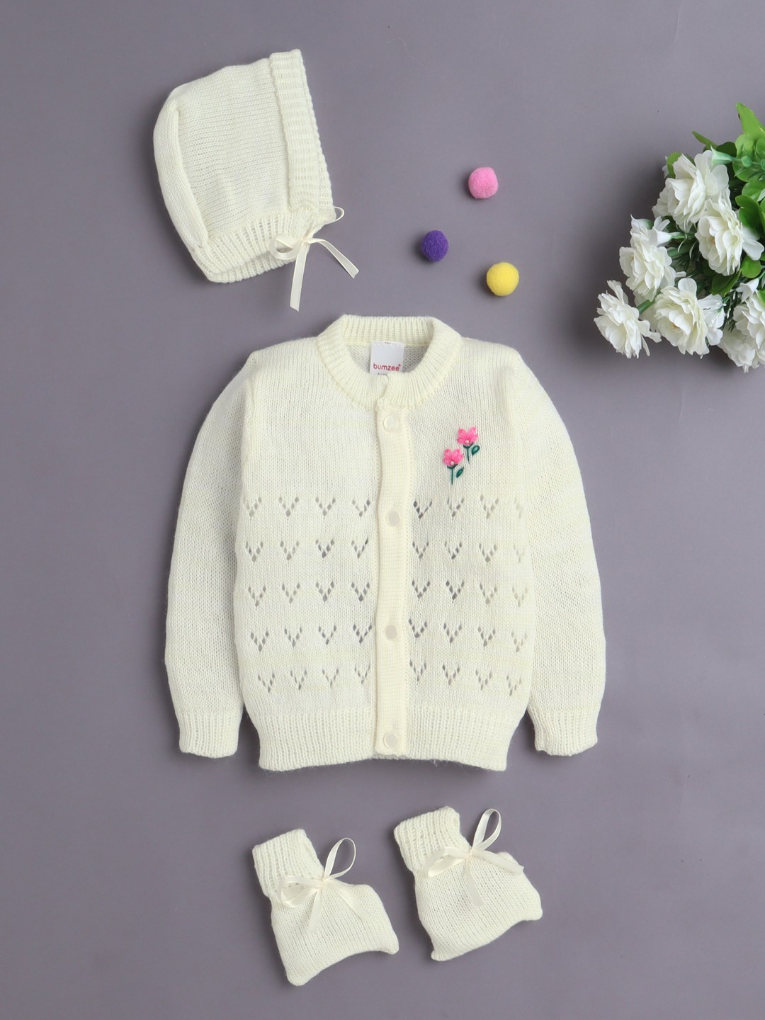 BUMZEE Green Baby Girls Full Sleeves Acrylic Blend Sweater With Cap & Socks